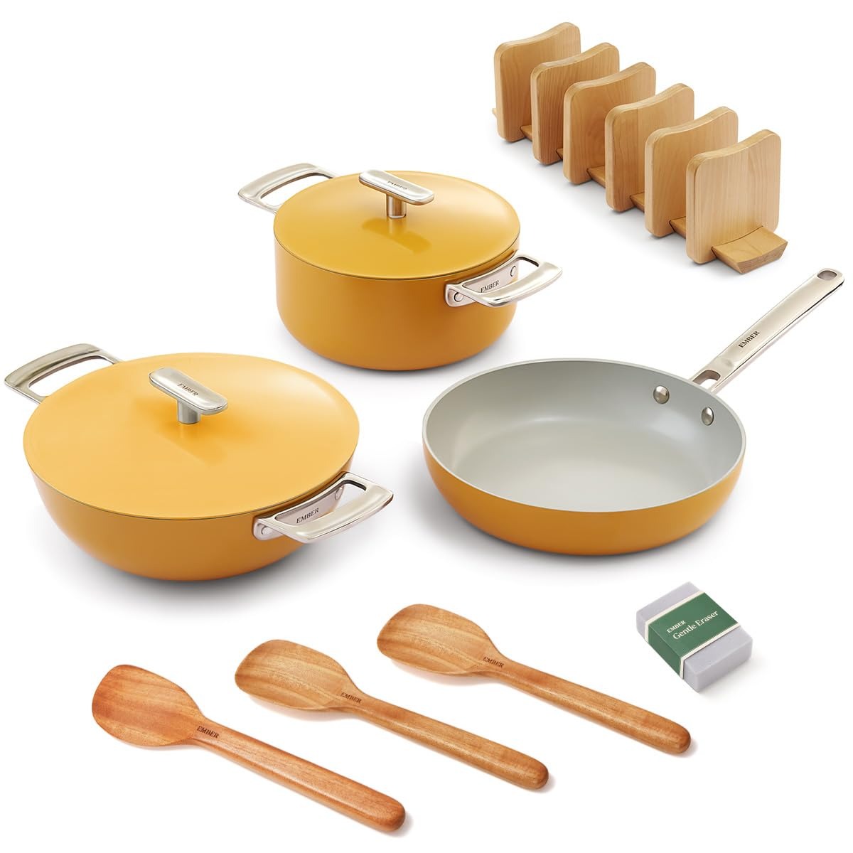 Includes essential cookware pieces plus wooden utensils and accessories.